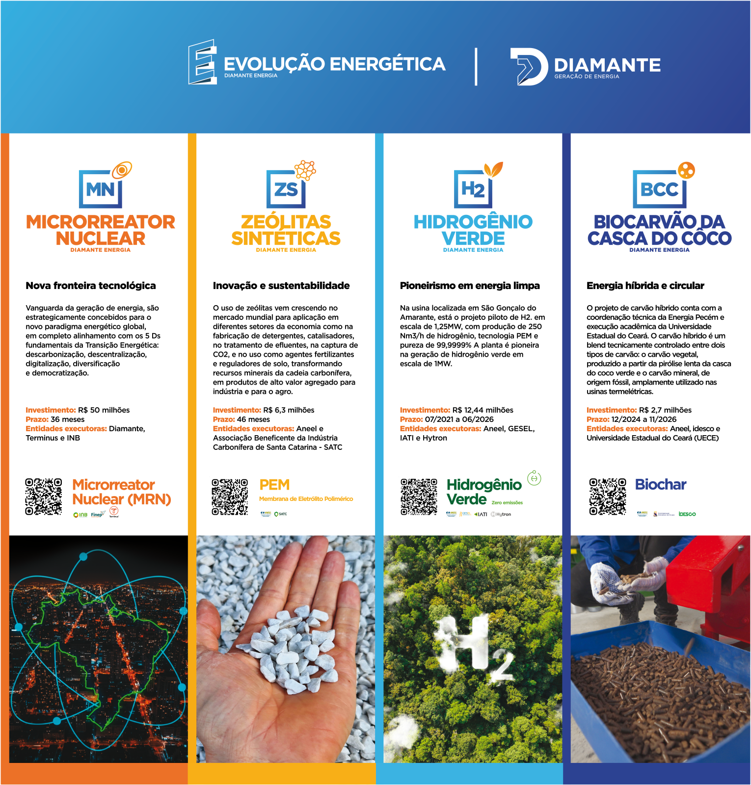 No Setor Energia, a Diamante apresentará quatro projetos de inovação em andamento. São eles: microrreator nuclear, zeólitas, hidrogênio verde e biomassa a partir da casca do coco. Os visitantes poderão conhecer mais sobre as iniciativas desenvolvidas nas usinas Energia Pecém (CE) e Complexo Termelétrico Jorge Lacerda (SC) conversando com os pesquisadores e verificando de perto equipamentos utilizados e amostras dos materiais produzidos.